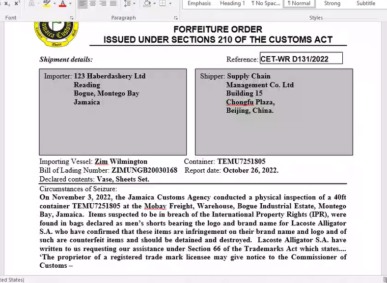 A forfeiture order gives a lengthy detail of what happened relating to the shipment